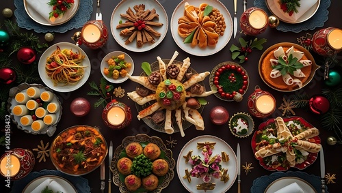 Top-down view of festive table with food, candles, and ornaments arranged for a cultural celebration, clean and balanced composition