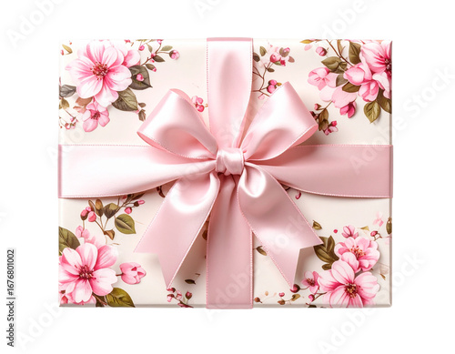 Top-Down View of Luxury Gift Box with Pink Floral Ribbon Transparent Background
