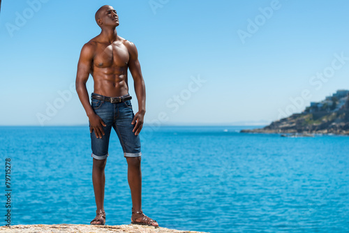 Topless African black man standing with short jeans