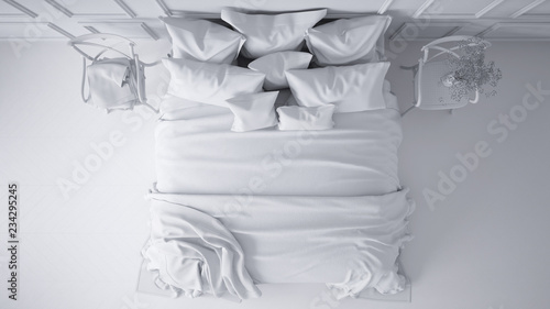 Total white project of vintage classic bedroom with soft bed full of pillows and blankets, white molded wall, wooden side chairs, elegant interior design, top view