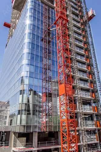 skyscraper, construction, crane, lyon, architecture, city, apartment building, round, work, building site, top, loftiness, floor, glasses, mirror image, light, office