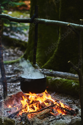 Tourist boilers filled with water hang over the bonfire burning in the green forest.