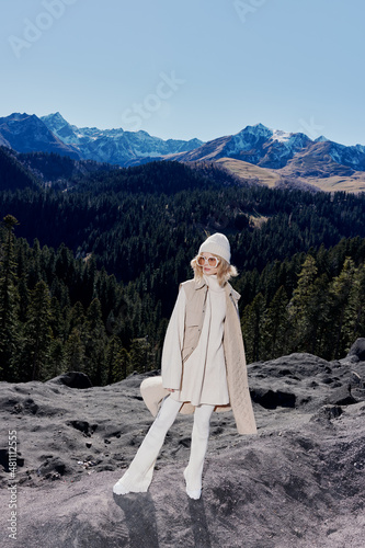 woman, fashion, mountain, goggles, stone, nature, blond, white, female, hat, beauty, rock, beautiful, lifestyle, young, travel, winter, pine, freedom, model, girl, snow, landscape, clothes, person, happy, adult, holiday, autumn, forest, outside, portrait, face, hair, hiking, adventure, attractive, leisure, sky, style, background, spring, carefree, elegant, lady, one person, smile, trip, sunny