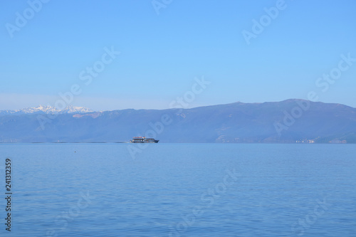 Tourist ship is sailing on Ohrid Lake. Mountain background. Ohrid, Macedonia.
