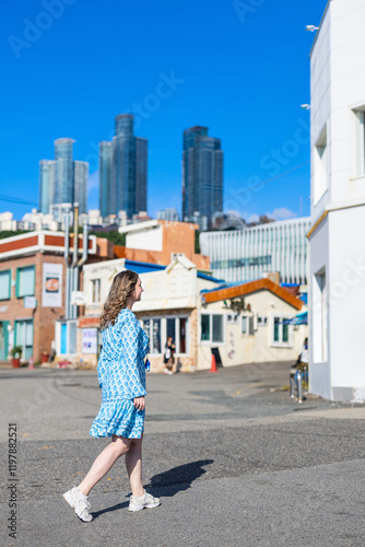 casual attire, girl, lifestyle, travel, woman, holiday maker, adventure, traditional, walking, outdoors, city, street, journey, architecture, culture, vibrant, city landscape, urban, sightseeing, modern, skyline, exploration, blue skies, building, skyscraper, south korea