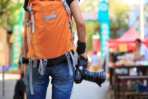 holiday maker, camera, street, ancient, xian, china, chinese, photographer, hand, hold, walking, rear, backpacker, backpack, travel, destination, trip, asian, female, girl, woman, black