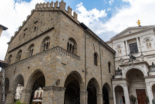 Tourists destination, historical part of Bergamo city, Bergamo Alta with narrow streets, churces, old houses, located on hill with fortress walls, Lombardy, Northern Italy