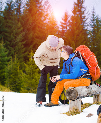 holiday maker, adventure, phone, landscape, backpack, mountain, travel, tour tourism, snow, winter, man, people, hiker, hiking, lifestyle, nature, view, trekking, active, sport, white, smartphone, sky, adult, traveler, cold, hike, portrait, blue, caucasian, happy, mobile, person, backpacker, climbing, day, extreme, walking, peak, young, male, background, 2, friends, partner, map, discussion, dialogue