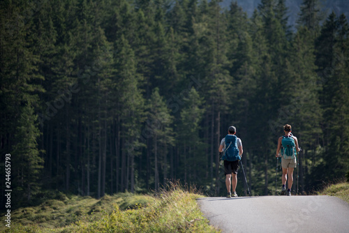 Tourists on the forest road in the Switzerland, Monch and Jungfrau mountain (Swiss Alps) in the background, Berner Oberland, Grindelwald