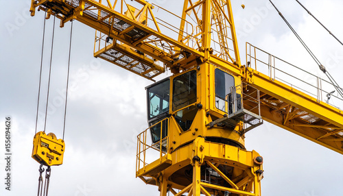 Tower Crane at Work: A vibrant yellow tower crane stands tall against a cloudy sky, showcasing intricate machinery. A symbol of construction and development.