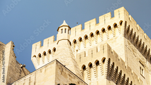 Tower with battlement and fortified wall of the Palais des Papes in Avignon, France