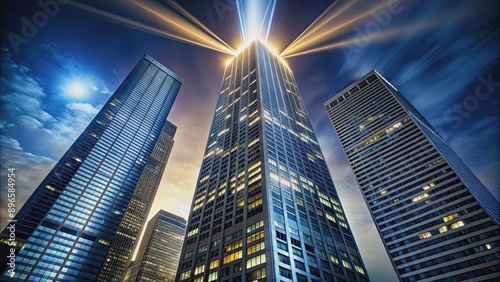 skyscraper, night, light, beam, tall building, architecture, city landscape, urban, skyline, illuminated, modern, city, glowing, exterior, beacon, dramatic, futuristic, design, impressive, majestic, structure, towering, beam of light