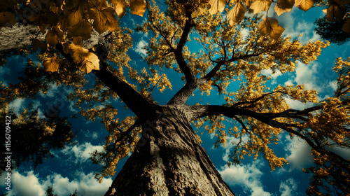 Towering Tree with Golden Leaves Against a Bright Sky
