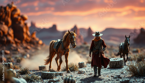 toy horses and a cowboy in the mountains