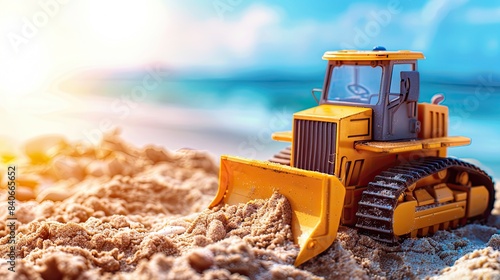 Toy yellow bulldozer is pushing sand on a sunny beach