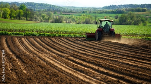 Tractor plowing a vast, freshly tilled field on a sunny day, with lush green hills in the background, showcasing agricultural activity in the countryside.