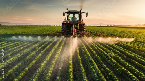 tractor, field, spray, crop, sunset, mist, water, row, green, plant, agriculture, farming, rural, landscape, gold, hours, sky, horizon, farm, machinery, red, brown, dirtied, ground, spraying, irrigation, fertilizer, pesticide, harvest, growth, nature, outdoors, countryside, summer, day, light, sun
