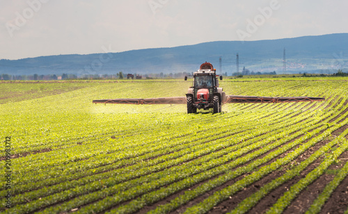 Tractor spraying pesticides on soybean field with sprayer at spring