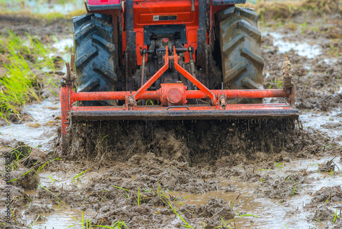 Tractor working on rice field