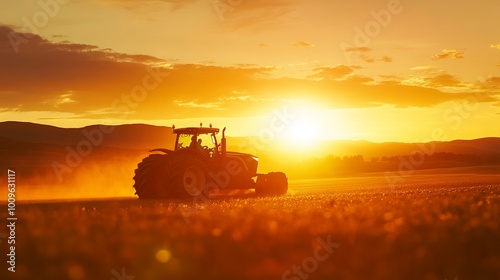Tractor working on the farm, cultivating crops under the golden hues of sunset. This modern agricultural machine symbolizes the evolution of farming