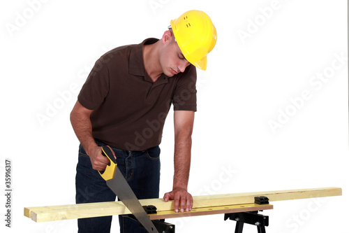 Tradesman sawing a piece of wood