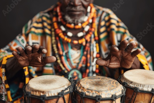 Traditional african drummer playing djembe at cultural event in vibrant attire