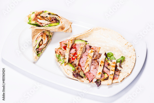 Traditional Arabic food "Shaorma" plate made out of tomatoes, salad and meat rolled in a pita