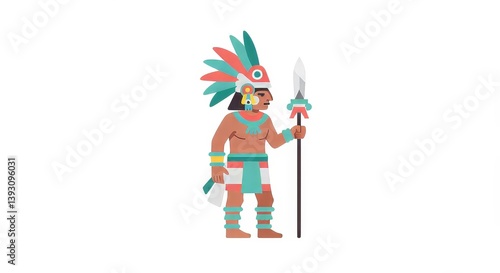 aztec, warrior, fighter, soldier, spear, shield, headdress, feather, costume, traditional, tribal, ancient, native, historical, culture, mexico, indigenous, battle, armoring, colourful, outfit, illustration, vector, flat, ceremonial, regalia, heritage, history, one person, male, strong, fierce, mythology, spiritual, civilisation, ethnic, weapon, protection, standing, primitive, hand-made, tribal art, old world, folklore