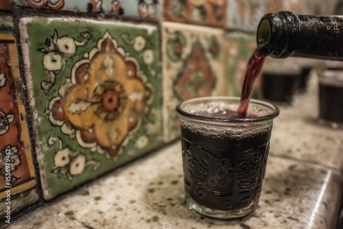 Traditional ceramic tiles and a glass being filled with dark red wine in a rustic setting