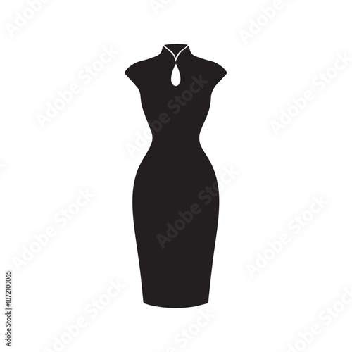 Traditional Chinese Dress Cheongsam Icon Vector Silhouette. Elegant Qipao Fashion Clothing Symbol. Asian Women Apparel Illustration for Boutique, Cultural Event, or Logo Design Isolated on White.