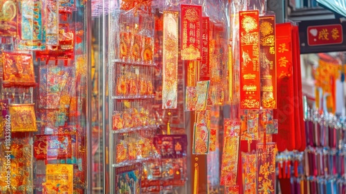 Traditional Chinese festival decorations and sale ads across a busy Hong Kong street, no people, ample copy space