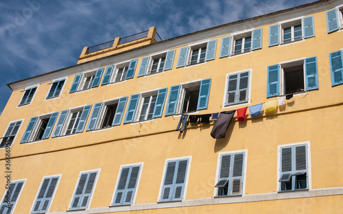 Traditional colorful painted building facade with blue shutters and laundry hanging in Bastia, Corsica, France