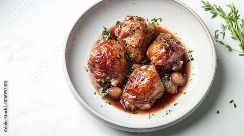 Traditional coq au vin, tender chicken cooked in red wine, placed on a clean, minimalist plate with an isolated background