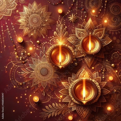 Traditional Diwali celebration background with a textured maroon surface decorated with shimmering gold motifs, flickering oil lamps, and sparkling fireworks. Oriental festival of lights. Ramadan