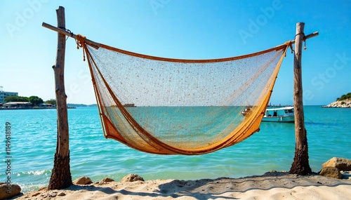 Traditional fishing net suspended between two wooden frames, coastal scene, boat, waterfront