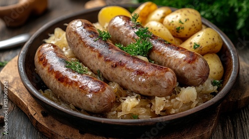 Traditional German bratwurst with sauerkraut and potatoes. Featuring a hearty and savory dish. Highlighting the texture and flavors of the bratwurst. Ideal for food and cultural themes.