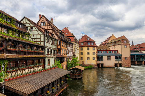 Traditional half-timbered houses on the canals district Petite France in Strasbourg, Alsace, France. UNESCO World Heritage Site