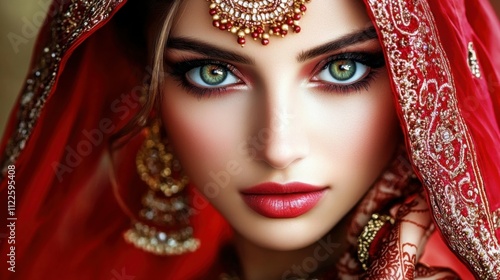 Traditional Hindu bride in vibrant red attire, intricate jewelry and elaborate makeup, eyes captivating and intense, a celebration of cultural beauty