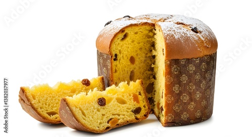 cake, holiday, dessert, sweet, food, pastry, grape, dough, yellow, sugar, powdered sugar, baked, traditional, festive, celebration, delicious, round, tall, slice, cut, raisin, fruit, baking, confectionery, treat, cookery, epicure, culinary, food photography, still life, studio shot, white background, isolated, tabletop, closeup, gold