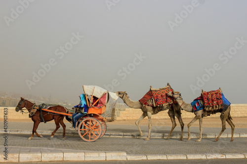 Traditional horse drawn cart with two camels following on busy road near Giza, Egypt