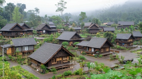 house, village, mountain, architecture, traditional, wood, dark, lush, green, misty, rain, serene, tranquil, nature, harmony, home, dwelling, building, landscape, scenery, view, scenic, picturesque, rural, countryside, peaceful, calm, quiet, remote, isolated, hillside, slope, vegetation, foliage, tree, plant, pathway, road, wet, damp, atmosphere, cloudy, sky, fog, morning, afternoon, day, habitat, settlement