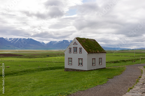 architecture, building, cabin, construction, bungalow, country, countryside, europa, exterior, farm, grass, green, habitation, historical, home, house, iceland, icelandic, landscape, mountain, nature, roof, rural, small, tour tourism, touristic, traditional, travel, turf, typical, vacation, village, window, wood, wooden, sky