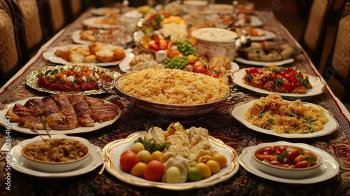 Traditional Iftar meal with family, large dishes of biryani, salad, and fruits on a table covered with an elegant cloth