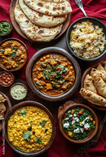 Traditional Indian Cuisine Spread Featuring Diverse Dishes, Flatbreads, Rice, and Condiments on a Vibrant Red Background