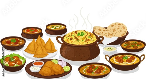 Traditional indian cuisine spread with samosas, biriyani, curry, and naan on a white background
