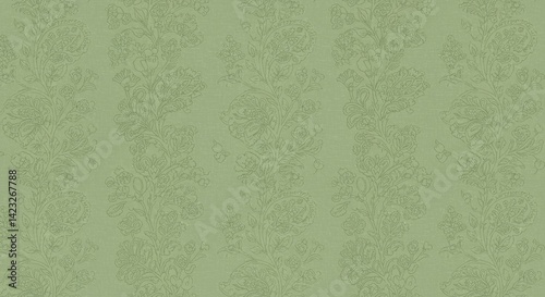 Traditional Indian Textile Muted Sage Green Kalamkari Botanical Print Nature Inspired Design Pattern Art Style