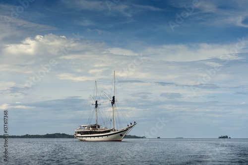 Traditional Indonesian Phinisi Schooner. The pinisi or phinisi is a traditional Indonesian two-masted sailing ship. These boats are made to ply the waters of the Indonesian archipelago in Raja Ampat.