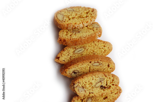 Traditional Italian Cantucci or Cantuccini cookies with almonds isolated on white background