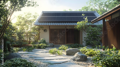 Traditional Japanese House with Solar Panels in a Summer Garden Landscape