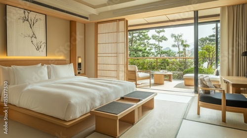 Traditional Japanese suite with tatami mats, shoji screens, and a serene garden view